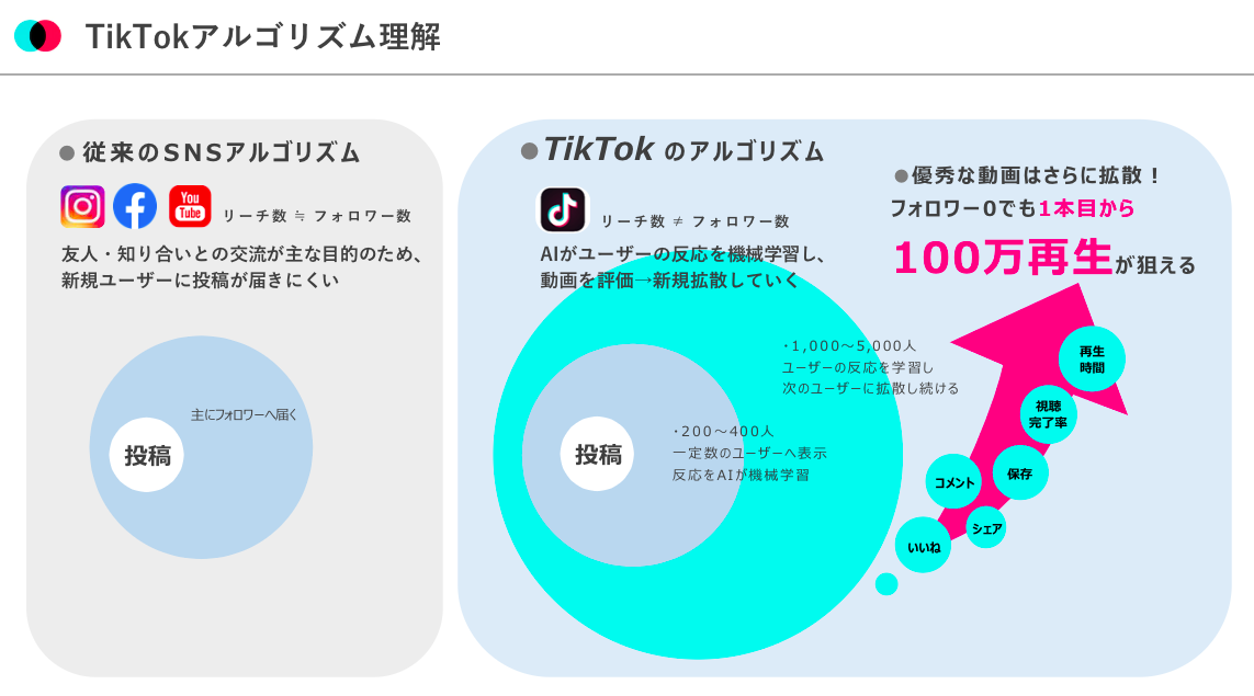一方、TikTokは「発見型SNS」。 フォロワー数や知名度がゼロでも、AIがユーザーの反応を学習し、動画を適切に評価・拡散していきます。 これが「アルゴリズム」であり、TikTok最大の特徴でもあります。