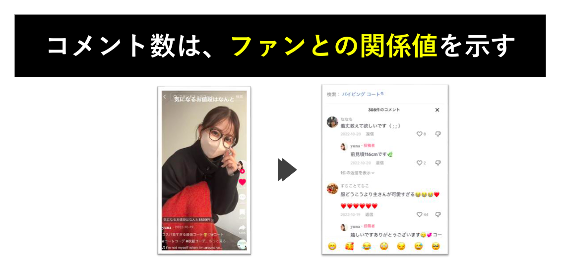 次にコメントは、視聴者と唯一直接的にやり取りできる手段であり、アカウントの人気度やファンとの関係性を示す重要な指標です。