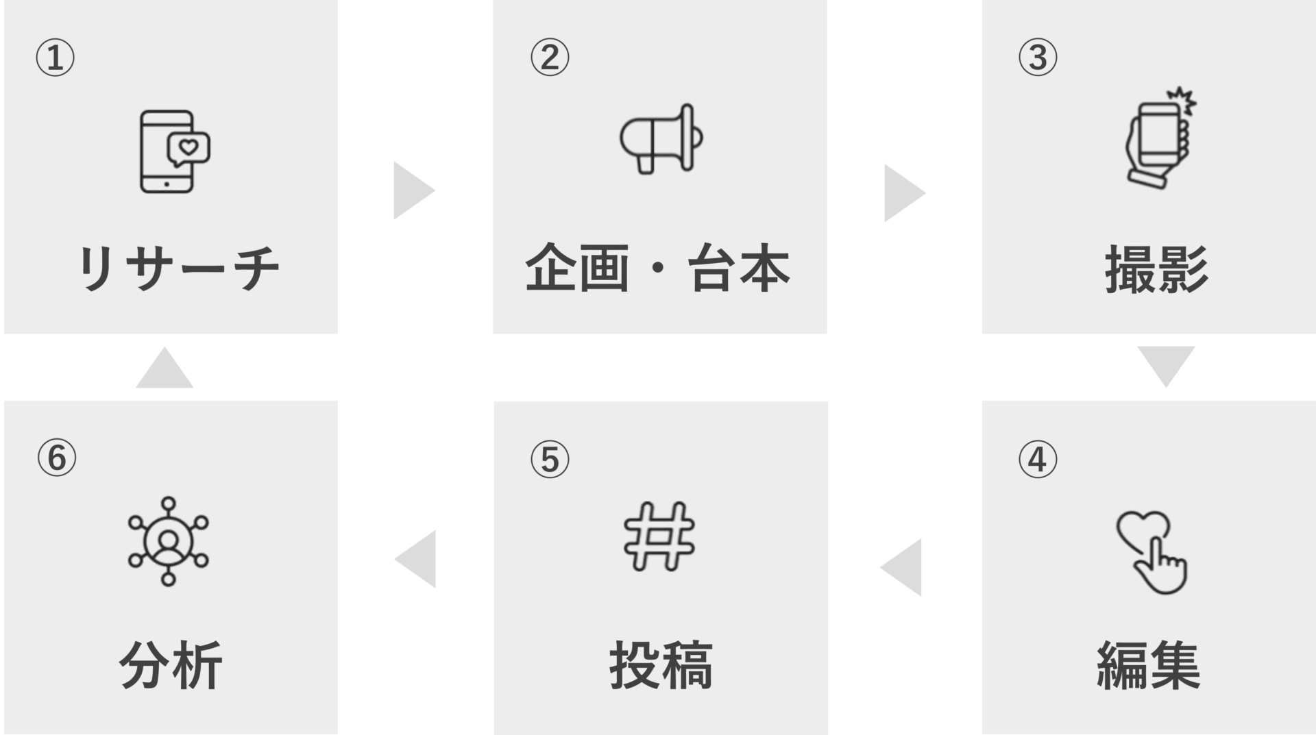 TikTokを伸ばすためには「思いつきで投稿する」のではなく、しっかりと流れを作って運用することが大切です。基本の流れは次の6ステップです。