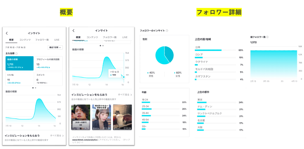 インサイト分析とは、TikTokのアカウントや動画のパフォーマンスを可視化する機能です。過去90日間までのデータを遡って確認でき、投稿の成果やファン層を把握することが可能です。特に運用初期や改善を行う際に、データに基づいた戦略が立てられるため非常に重要です。