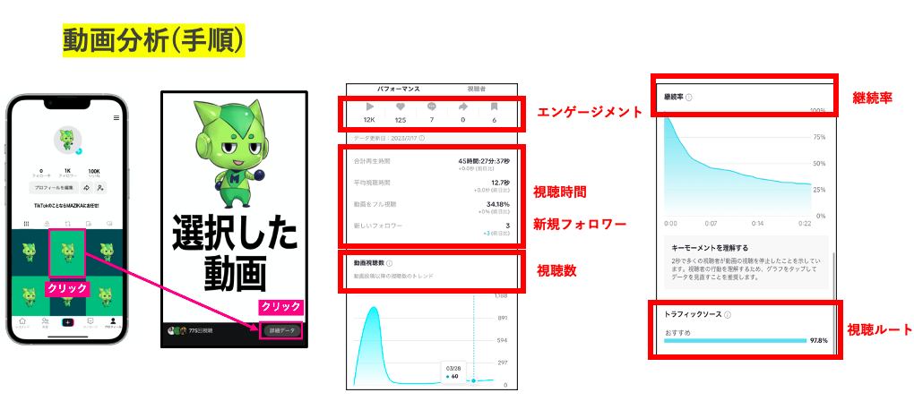 - 最初の3秒の継続率 TikTokでは冒頭3秒で動画を離脱されると、アルゴリズムで評価されにくくなります。目安は50%以上の継続率で1万再生以上を目指すこと。