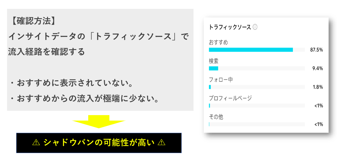 アカウントが凍結されたわけではないものの、意図的に投稿の露出が制限される状態を指します。 しかしユーザー側には明確な通知が来ないため気づきにくく、再生数やエンゲージメントが極端に下がって初めて気づくことが多いのが特徴です。
