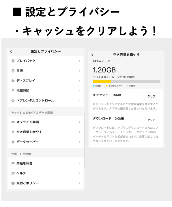 1. TikTokアプリの設定からキャッシュを削除し、動作をリセットすることで改善する場合があります。
