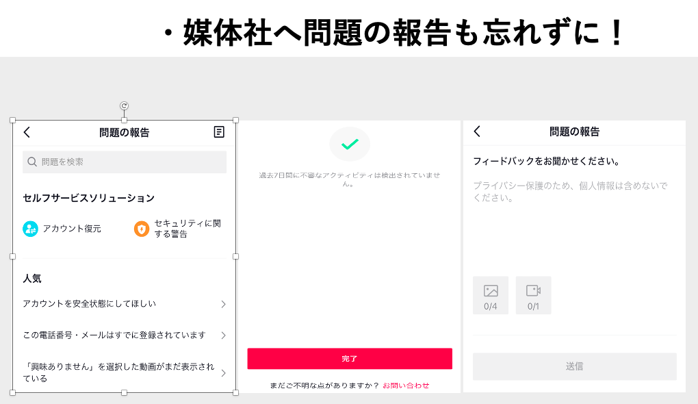 1. 「おすすめに表示されない」などの問題をアプリ内から報告し、TikTokサポートに確認してもらいましょう。